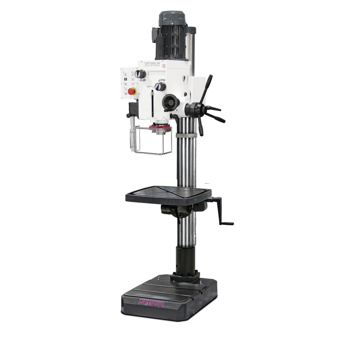 Die Optimum OPTIdrill DH 40G mit 1,1 kW / 1,5 kW und MK4 Spindelaufnahme bei einer Nenngröße von 590 x 700 x 2.050 mm - schweren Säulenbohrmaschinen mit Getriebe (12 Geschwindigkeiten).
